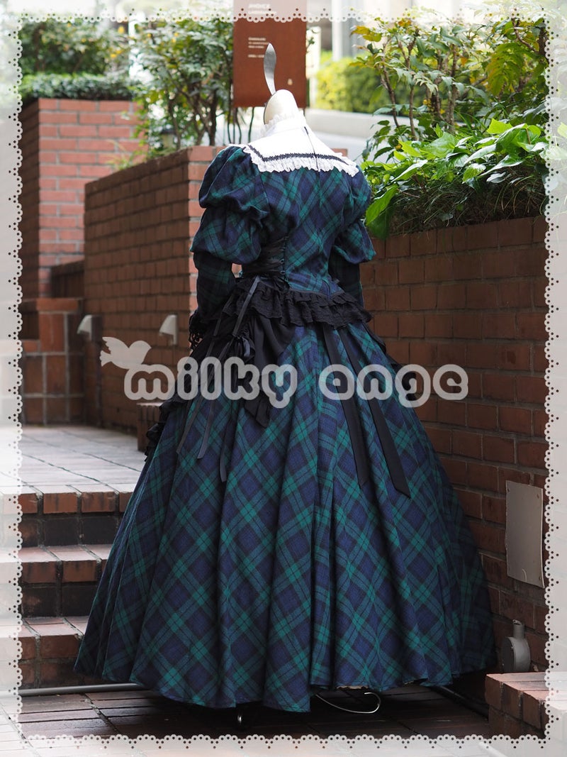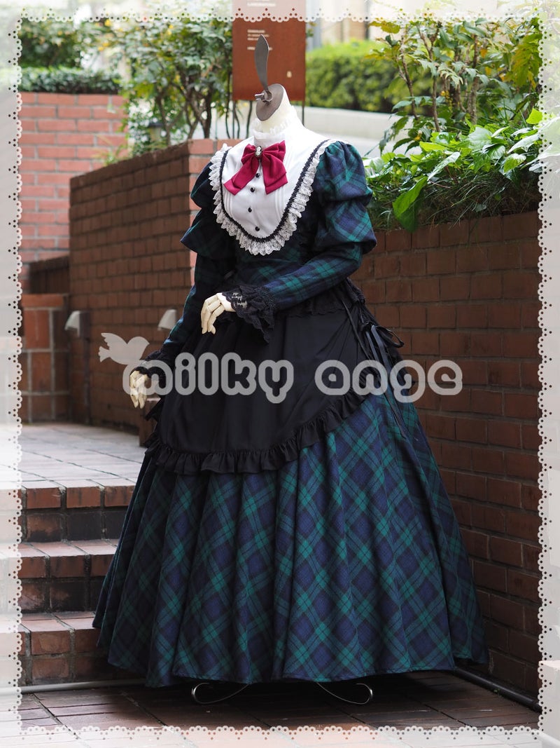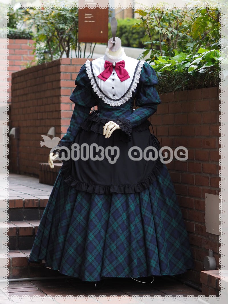 グリーンのチェック生地に大きな白いヨークが映えるフレンチスタイルメイド服です。エプロンは柔らかなドレープを描くシフォン素材。サテンリボンを絞り、たくし上げスタイルでお召し下さい。ワンポイントになっている胸の赤いリボンは、お好みで別の色のリボンを合わせて頂いても素敵です。