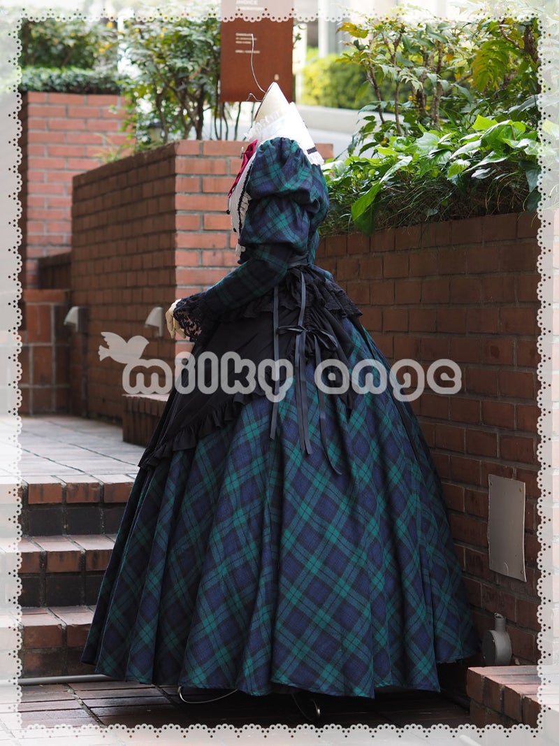 グリーンのチェック生地に大きな白いヨークが映えるフレンチスタイルメイド服です。エプロンは柔らかなドレープを描くシフォン素材。サテンリボンを絞り、たくし上げスタイルでお召し下さい。ワンポイントになっている胸の赤いリボンは、お好みで別の色のリボンを合わせて頂いても素敵です。