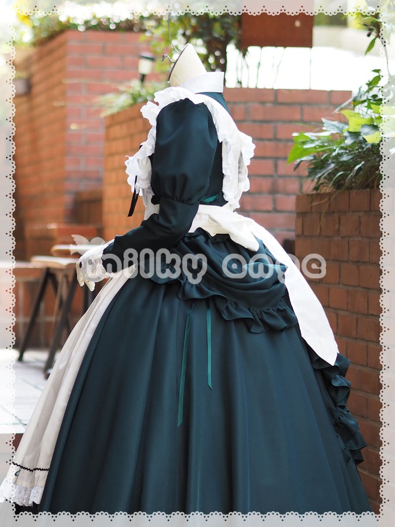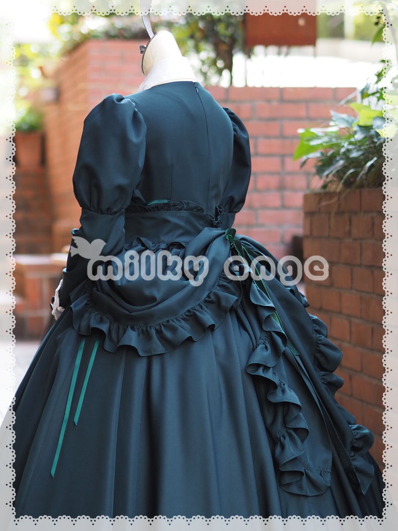 ヴィクトリアン王朝時代のメイド服をイメージした、とてもクラシックなバッスル付きメイド服です。バッスルの周囲に共布フリルをあしらい、ロングバッスルドレスとしても着用できるように可愛く仕上げました。