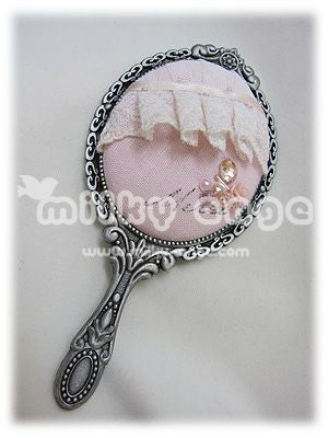 レースやビーズが散りばめられたアンティークなハンドミラーです。