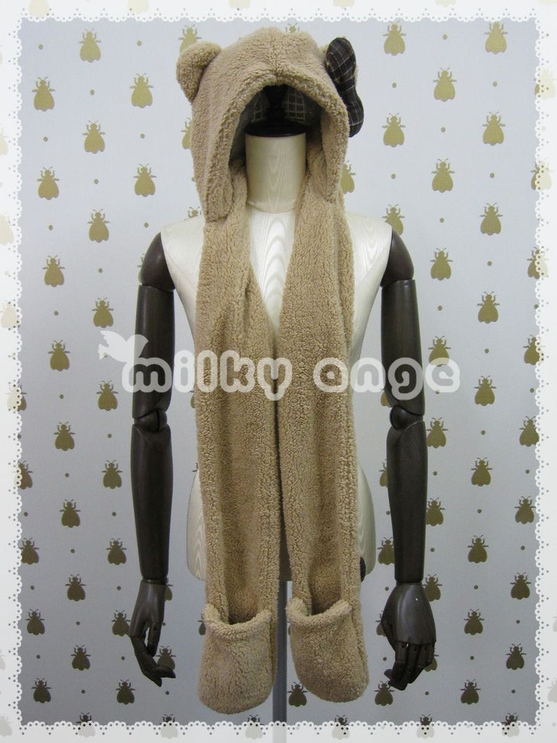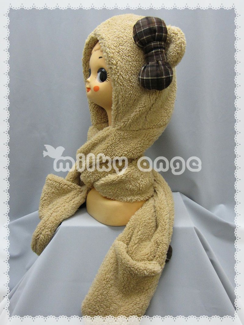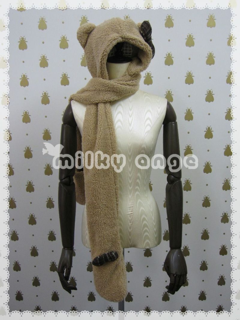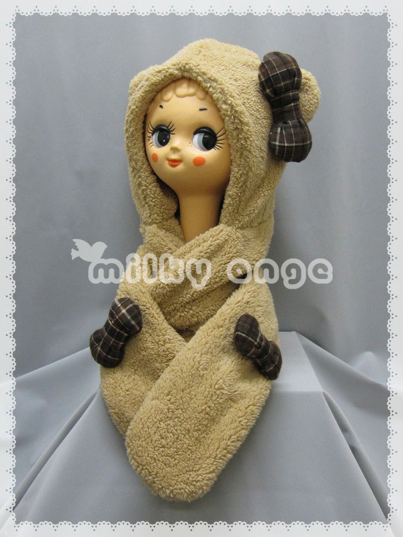 寒い季節にぴったりの、あたたかい・可愛い・軽いの三拍子そろった、くまみみが付いたフードが特徴のフーディマフラーです。